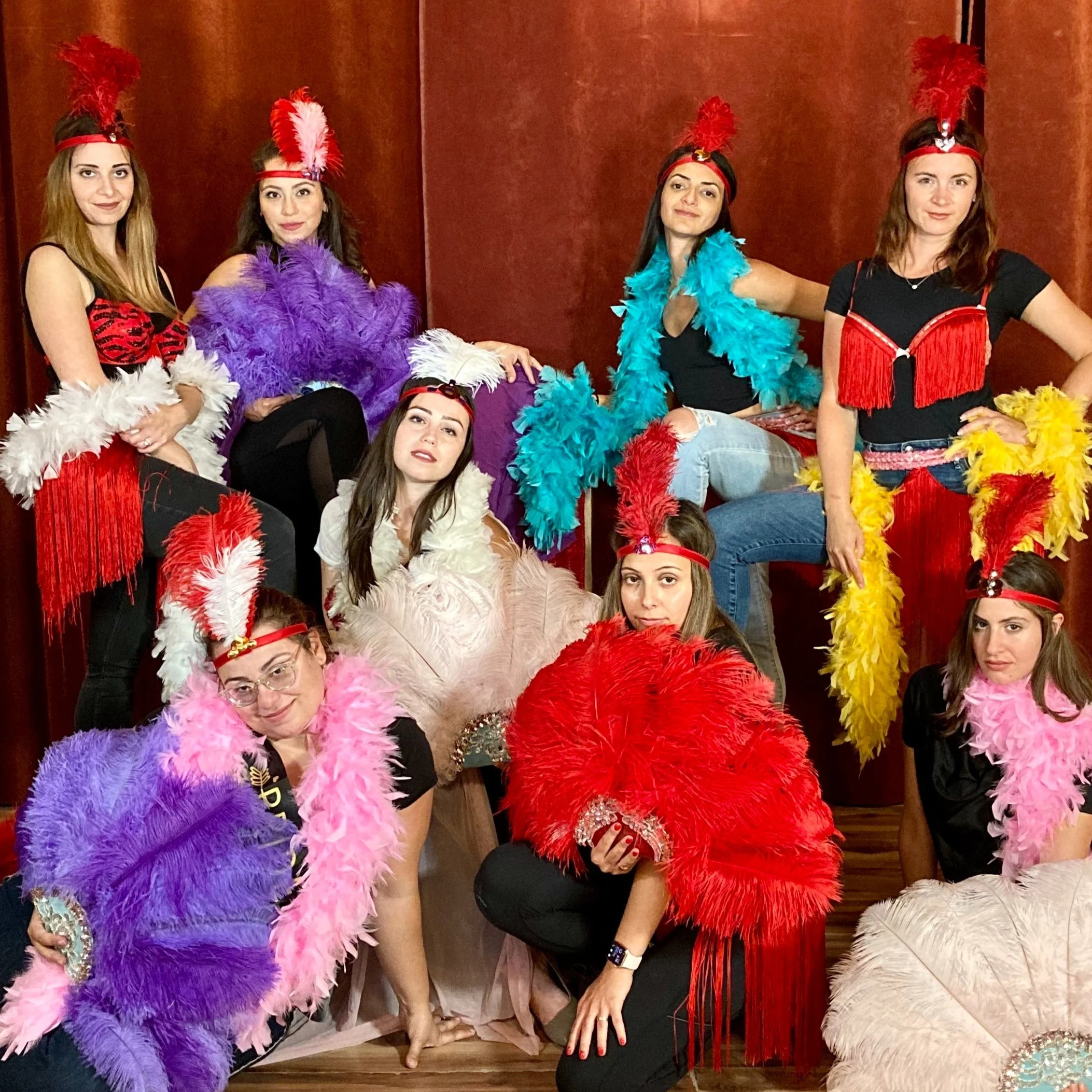Photos: plongez dans notre collection complète de costumes et accessoires burlesques et choisissez une tenue dans le style qui vous inspire le plus ! Nous avons tous, des chapeaux cabarets et des cannes aux corsets et coiffes en plumes. Nous aidons chaque participant à trouver sa version glamour pour la photo de groupe prise dans notre photobooth (on vous envoie les copies digitales apres qu’ils soient retouchée professionnellement)