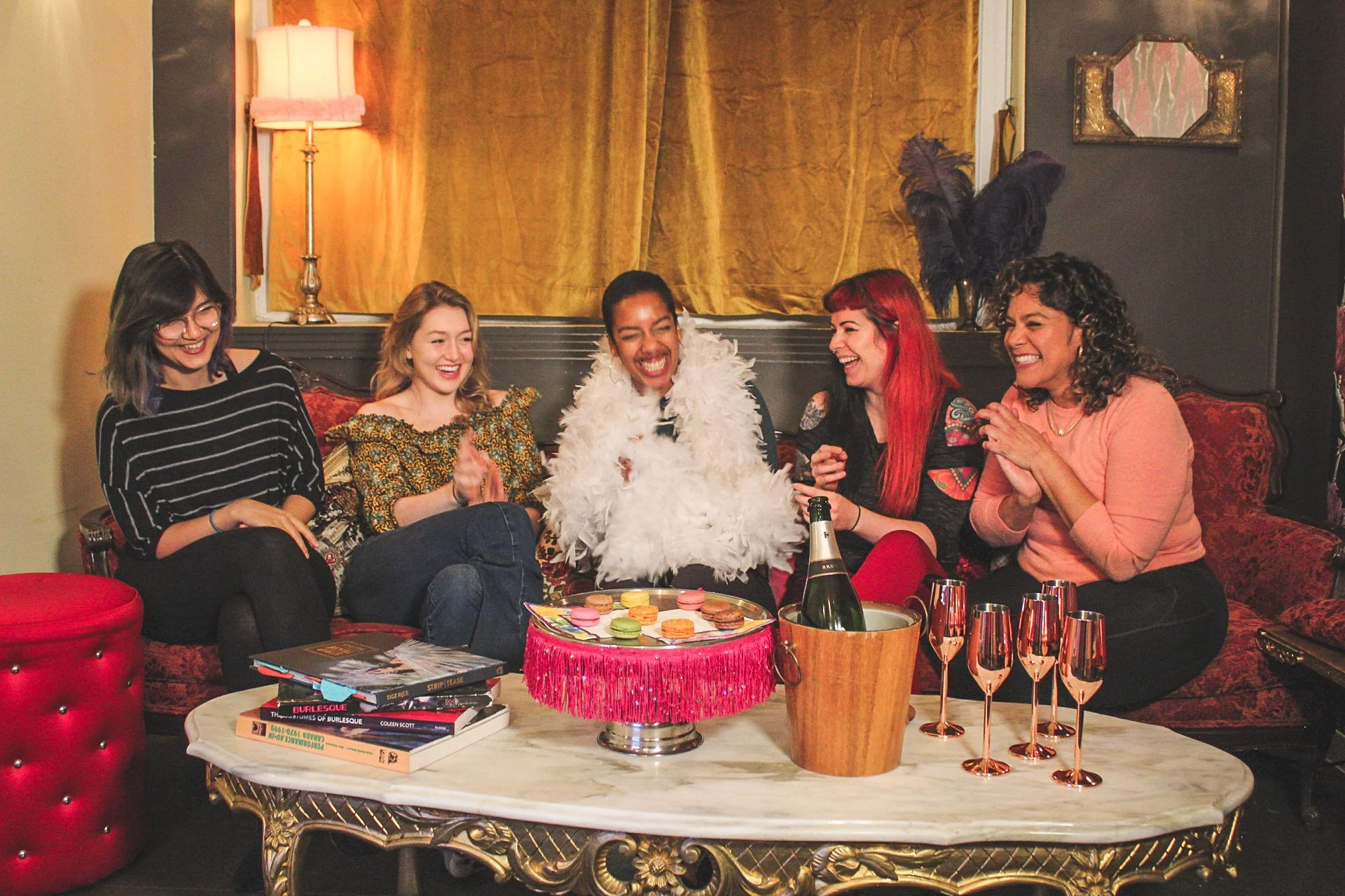 L'expérience burlesque complète! Champagne, macarons servis dans notre lounge rétro, une heure de cours avec des jeux sexy, de la danse et un accès à notre costumier boudoir pour s'habiller pour un photoshoot de groupe et individuel (collection de photos déjà pris ici!)